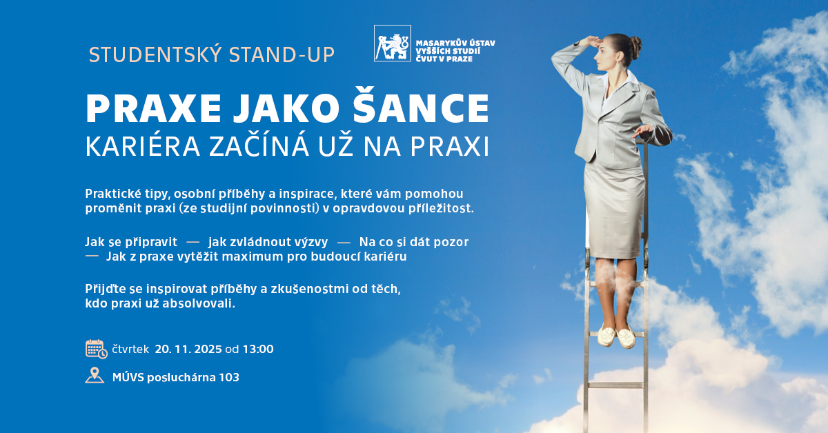 Na Masarykově ústavu vyšších studií ČVUT v Praze jsme se letos rozhodli přistoupit k prezentaci profesních praxí jinak než obvykle. Místo tradičního veletrhu firem jsme zvolili formát, který dává hlavní slovo těm, kteří mají s praxí nejčerstvější zkušenost – samotným studentům. Vznikl tak Studentský Stand Up „Praxe jako šance“, během něhož sedm studentů představilo svůj tři měsíce dlouhý pobyt ve firmách a nabídlo pohled do zákulisí každodenního fungování v pracovním prostředí.